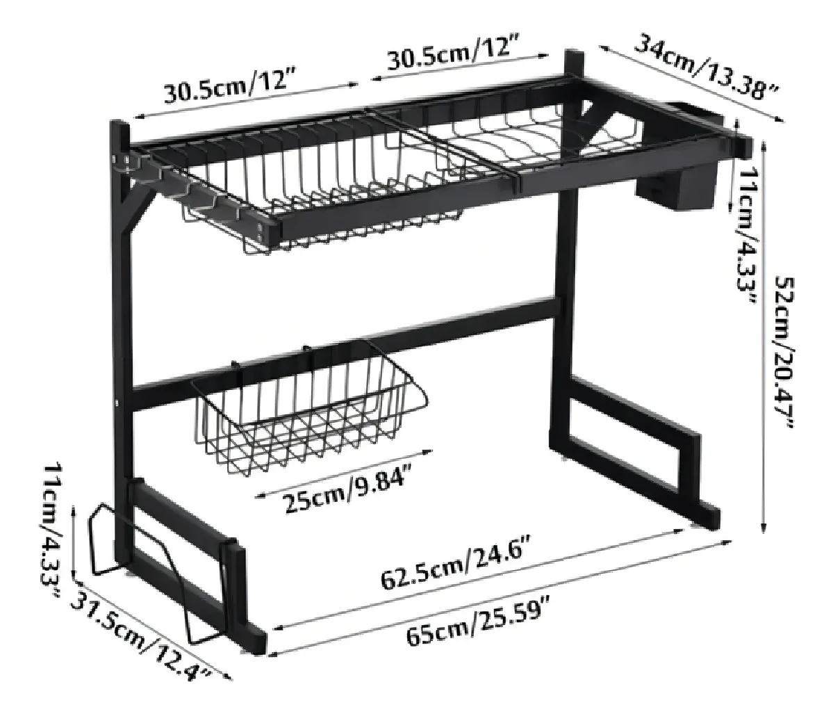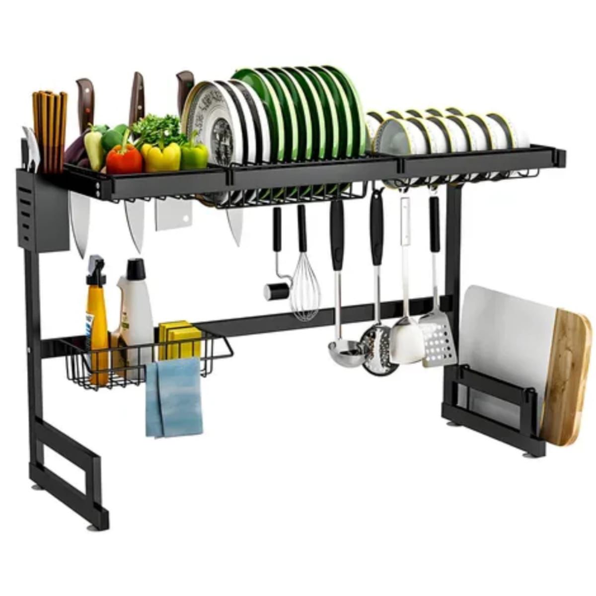 Escurridor de cocina multifunción de acero, ideal para mantener tu espacio organizado y optimizar el secado de vajilla. Cuenta con amplia capacidad para platos, vasos y utensilios, además de ganchos para colgar cucharones y soportes para cuchillos y tablas. Su diseño resistente y moderno en color negro se adapta perfectamente a cualquier cocina, brindando practicidad y estilo en un solo producto.