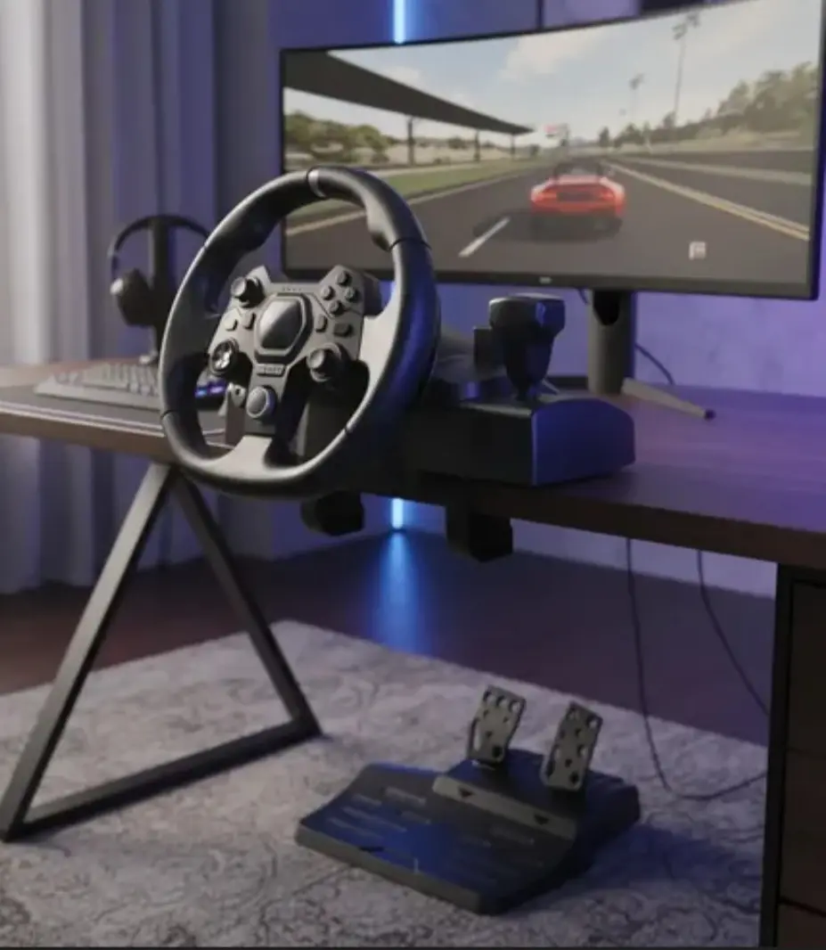 ❌ Giro limitado (180° vs 900° de volantes profesionales)